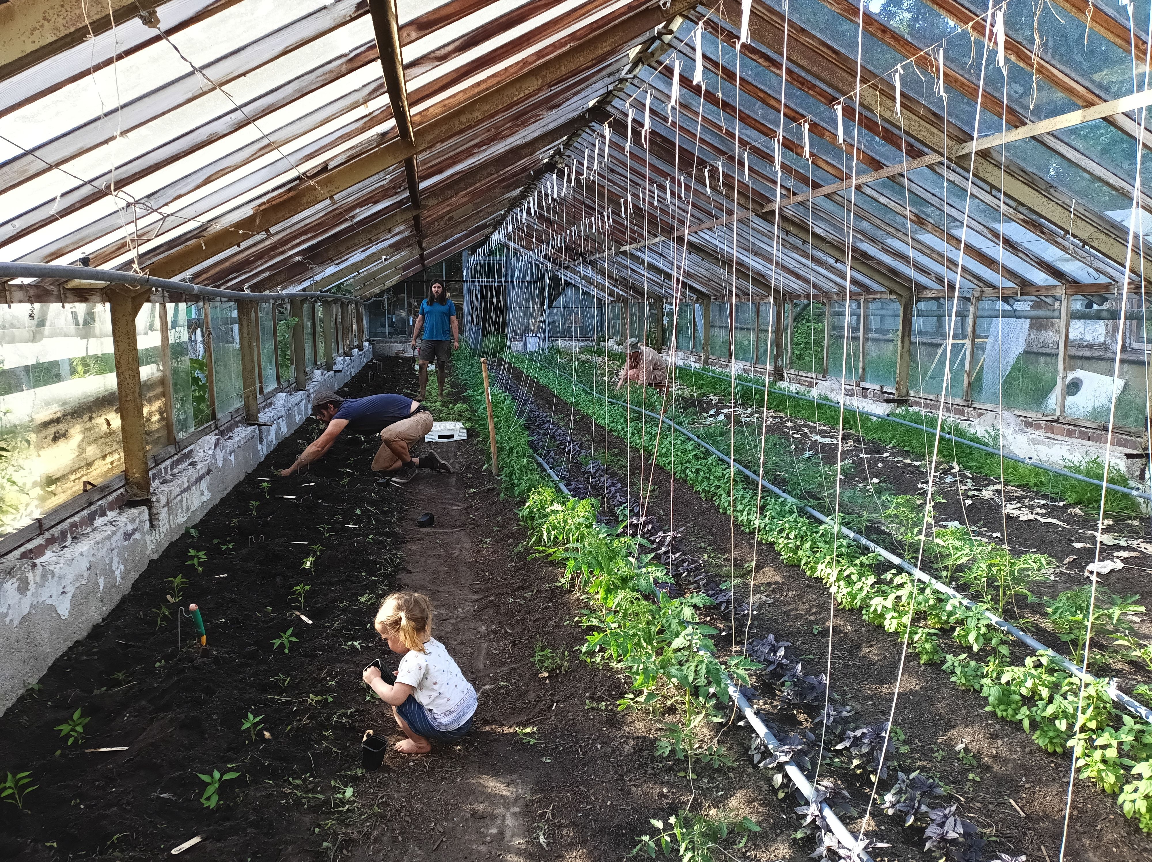 Der Anbau in den Gewächshäusern sowie auf den Freilandflächen erfolgt in leidenschaftlicher Handarbeit. Wir betreiben Biointensiven Gemüsebau, setzen Pflanzen in Mischkultur, verwenden Permakultur-Elemente. Wir verwenden unseren Rasenschnitt als Boden verbessernden Mulch. Dadurch werden die Regenwürmer in die Beete gelockt, welche uns nach und nach beim Aufbau von neuem humusreichen Boden unterstützen.