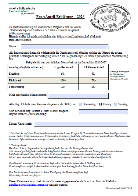 Unser Gartenjahr beginnt zum 01. Mai jeden Jahres und geht bis 30. April des Folgejahres. Derzeit haben wir 70 Ernteanteile, die über eine Bieterrunde vergeben werden.